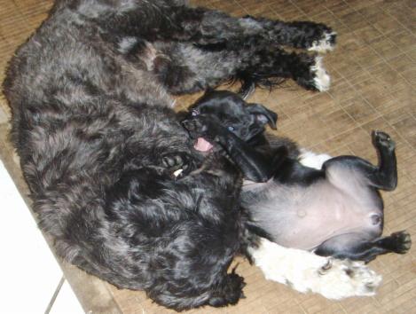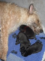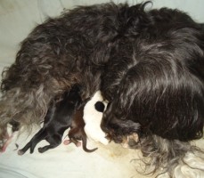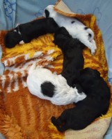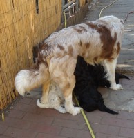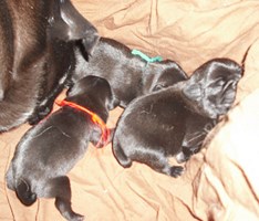 Vor 2 Tagen ist unser Clärchen Mutter geworden. Beim abnabeln und sauber machen, hatte sie unterstützung von Gundel, wobei sie die natürlich nicht gebraucht hätte- aber eine Hebamme schadet ja nie! Es sind 1 Rüde und 2 Hündinnen geworden, alle ganz die Mama - sie sind schwarz !
