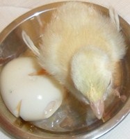 Dafür kam das schreckliche in der Nacht vom 3 auf den 4 Mai. Einer konnte, wie vor 2 Jahren, mal wieder seinen Hund nicht ordentlich beaufsichtigen, und er ist in den Lachshuhn Stall eingebrochen, drei gerade mal einjährigen Henen, ich hatte sie zur Blutauffrischung für dieses Zuchtjahr aus Ibbenbühren geholt, völlig sinnlos aus purem Spaß am jagen ins Genick gebissen und so getötet. Unser Hahn Tristan, hat gekämpft wie ein Löwe, und wohl noch schlimmeres verhindert. Aber er ist verletzt, sehr geschwächt, und hat einen tiefen Schock. Ich kämpfe verzweifelt um sein Leben. Wenn ich ihm aber seine Medikamente gebe, steht er sofort auf, und bleibt solange ich bei ihm bin stehen, nur damit ich nicht merke wie krank er ist. Fühlt er sich unbeobachtet legt er sich wieder völlig geschwächt hin. Ich könnte heulen, aber so ein tapferer Held, und Kämpfer wird doch bestimmt nicht sterben - bitte, bitte, bitte ! In dem ganzen Trubel im Stall, sind zwei Küken von Emely im Ei beschädigt worden und starben. Eins konnte überleben und gut schlüpfen.