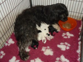 Die Züchterin ist etwas übernächtigt, da die Couch neben dem Körbchen mit den Welpen nicht so bequem ist, aber sonst sind alle wohl auf.